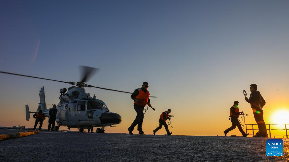 This file photo taken on Aug. 13, 2024 shows soldiers of the 46th fleet of the Chinese People's Liberation Army Navy participating in a shipborne helicopter flight training. A Chinese navy fleet returned to a military port in the coastal city of Zhanjiang, south China's Guangdong Province, on Friday after completing escort missions and joint exercises.