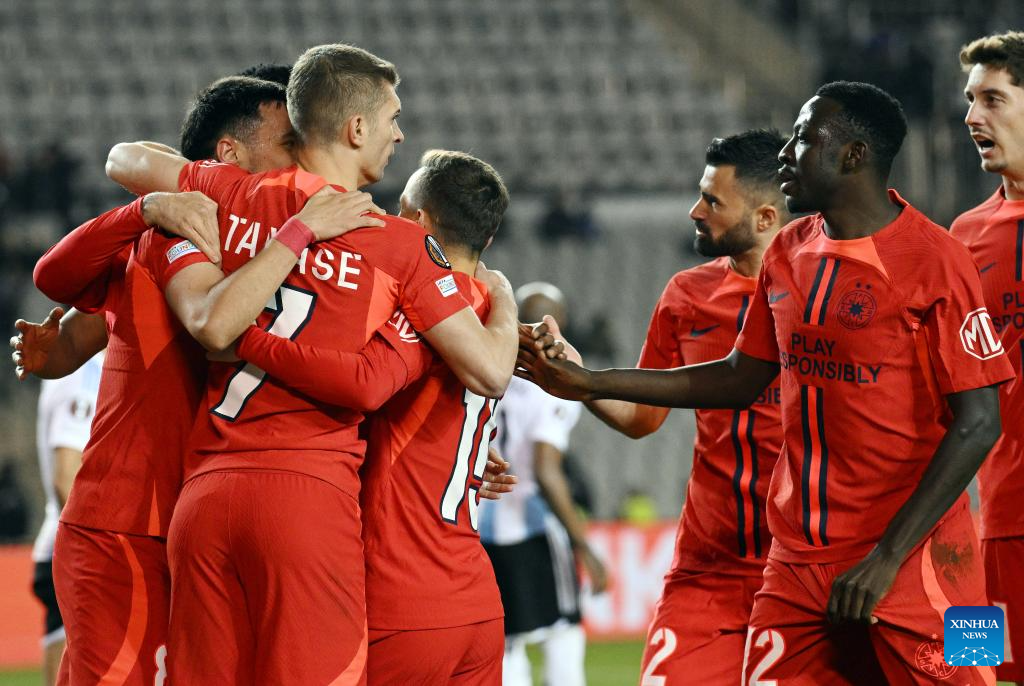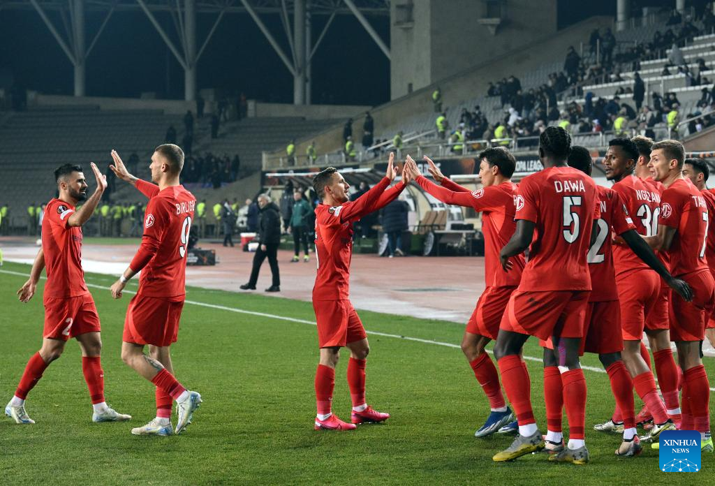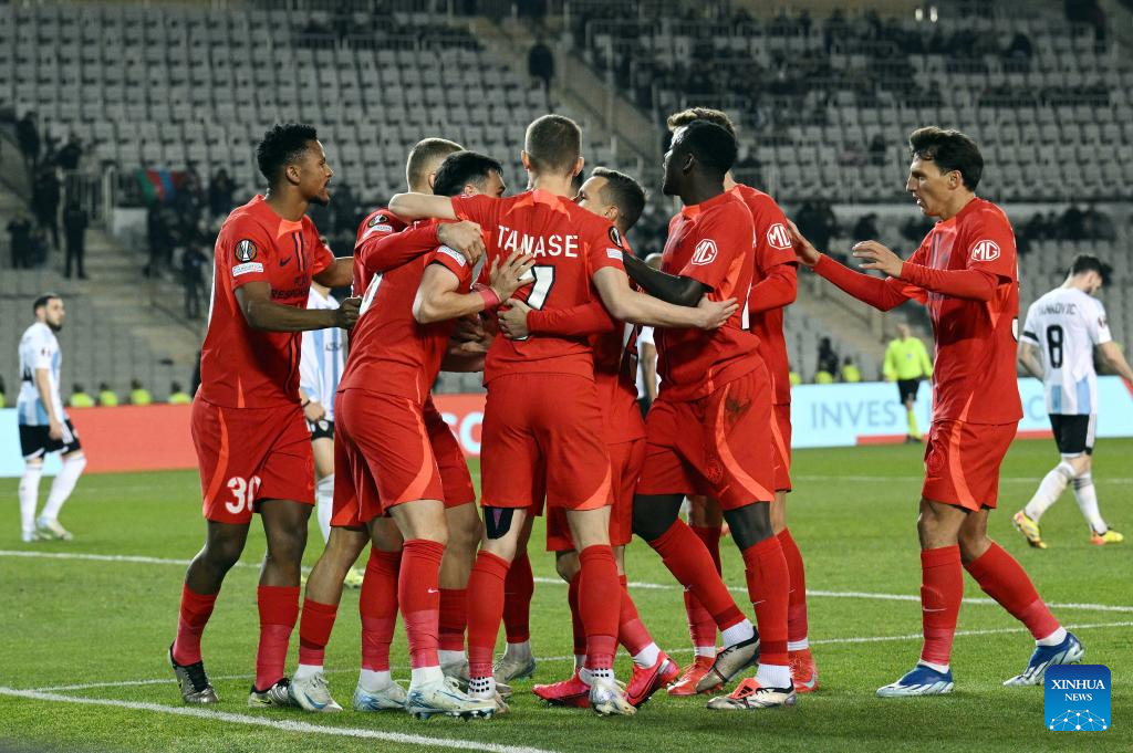 Players of FCSB celebrate during a UEFA Europa League match between Qarabag and FCSB in Baku, Azerbaijan, Jan. 23, 2025. (Photo by Tofik Babayev/Xinhua)