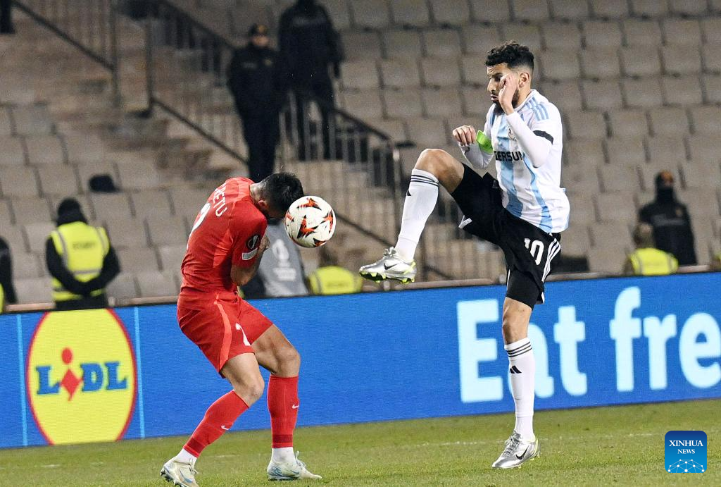 Valentin Cretu(L) of FCSB vies with Abdellah Zoubir of Qarabag during a UEFA Europa League match between Qarabag and FCSB in Baku, Azerbaijan, Jan. 23, 2025. (Photo by Tofik Babayev/Xinhua)