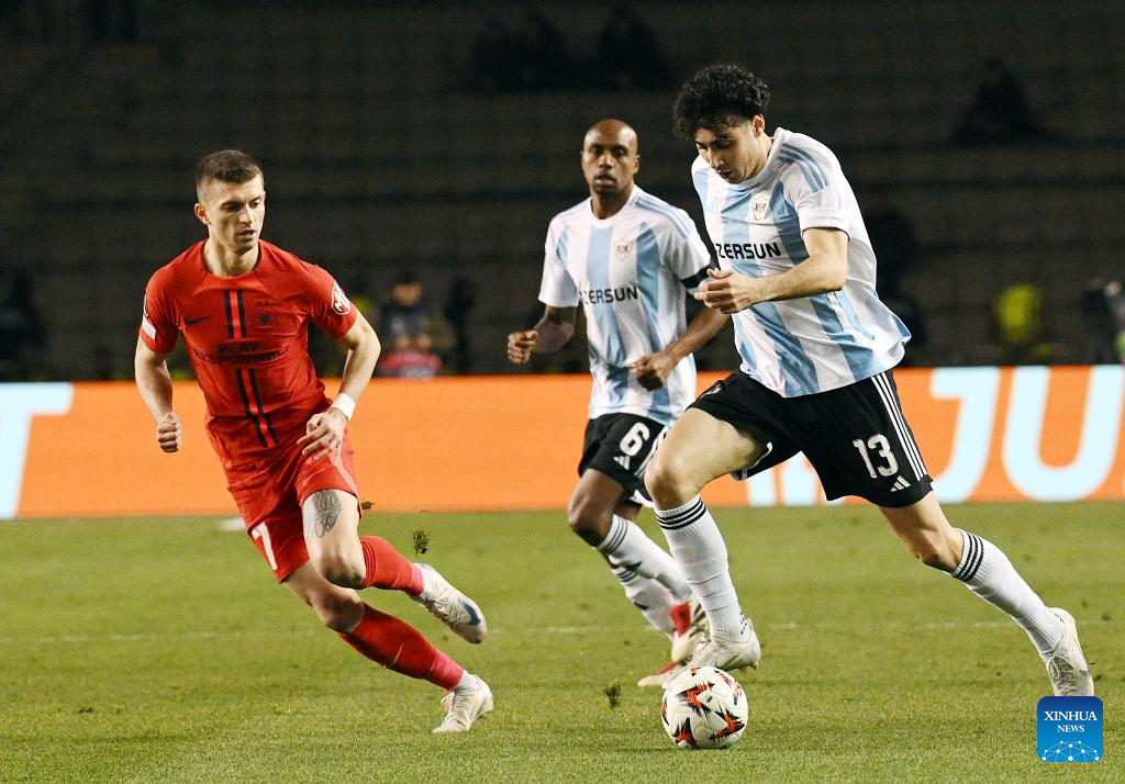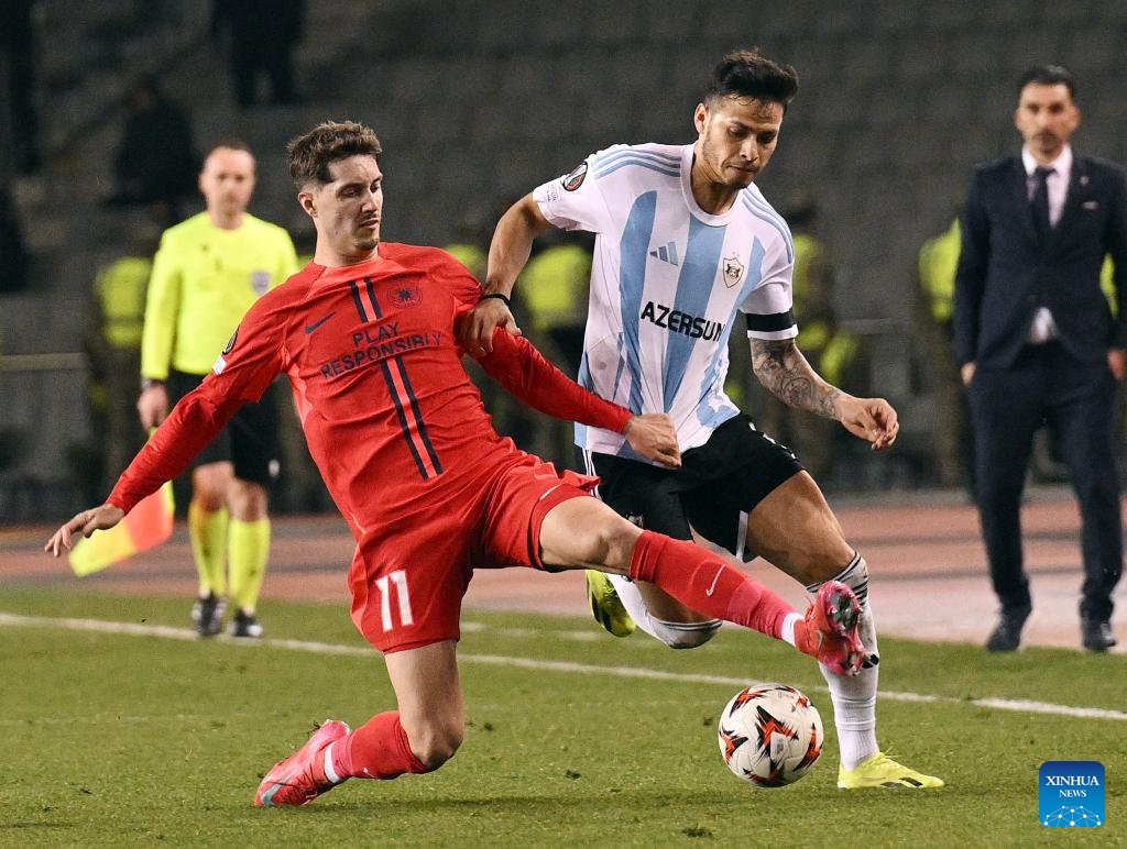 David Miculescu (L) of FCSB vies with Matheus Silva of Qarabag during a UEFA Europa League match between Qarabag and FCSB in Baku, Azerbaijan, Jan. 23, 2025. (Photo by Tofik Babayev/Xinhua)