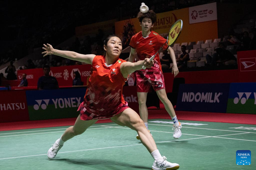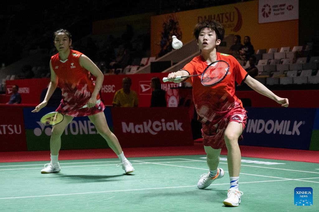 Jia Yifan (front)/Zhang Shuxian compete during the women's doubles round of 16 match between Jia Yifan/Zhang Shuxian of China and Li Yijing/Luo Xumin of China at the 2025 Indonesia Masters badminton tournament in Jakarta, Indonesia, Jan. 23, 2025. (Xinhua/Veri Sanovri)