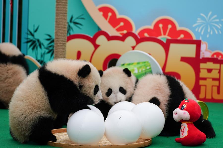 CHENGDU, Jan. 24 (Xinhua) -- Twenty-five giant panda cubs were gathered at two breeding bases in southwest China's Sichuan Province on Thursday to send Spring Festival greetings to global audiences.