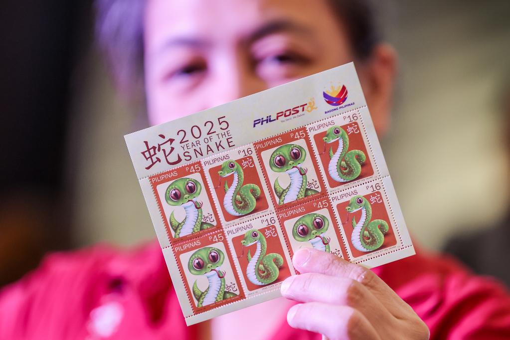A woman displays the Year of the Snake commemorative stamps during a launching ceremony in Manila, the Philippines, Jan. 23, 2025. (Xinhua/Rouelle Umali)