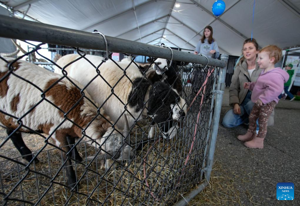 People visit farm animals at the 2025 Pacific Agriculture Show in Abbotsford, British Columbia, Canada, on Jan. 23, 2025. Showcasing the latest and most innovative equipment and technology for the agriculture industry, the three-day show kicked off here on Thursday. (Photo by Liang Sen/Xinhua)