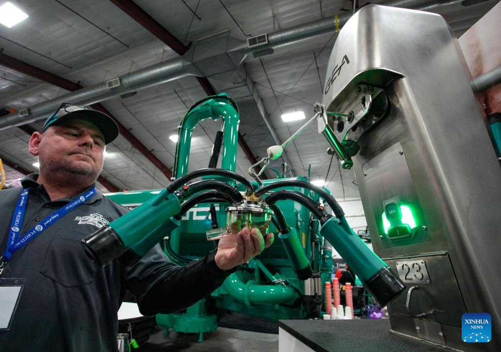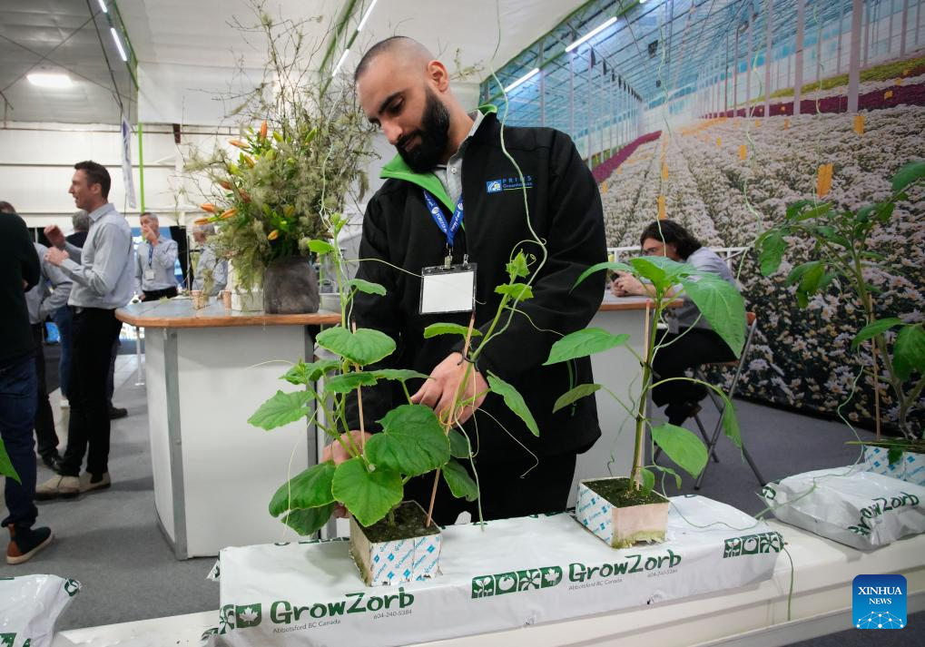 A man looks at a greenhouse farming system at the 2025 Pacific Agriculture Show in Abbotsford, British Columbia, Canada, on Jan. 23, 2025. Showcasing the latest and most innovative equipment and technology for the agriculture industry, the three-day show kicked off here on Thursday. (Photo by Liang Sen/Xinhua)