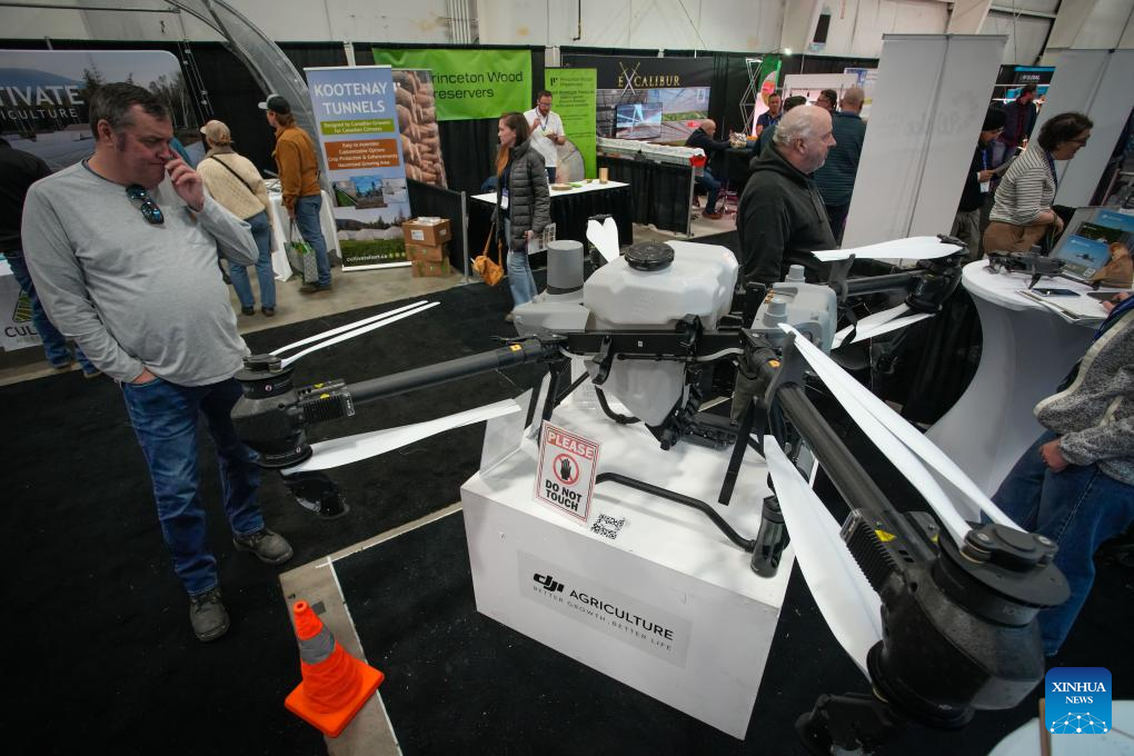 A man looks at an agricultural drone at the 2025 Pacific Agriculture Show in Abbotsford, British Columbia, Canada, on Jan. 23, 2025. Showcasing the latest and most innovative equipment and technology for the agriculture industry, the three-day show kicked off here on Thursday. (Photo by Liang Sen/Xinhua)
