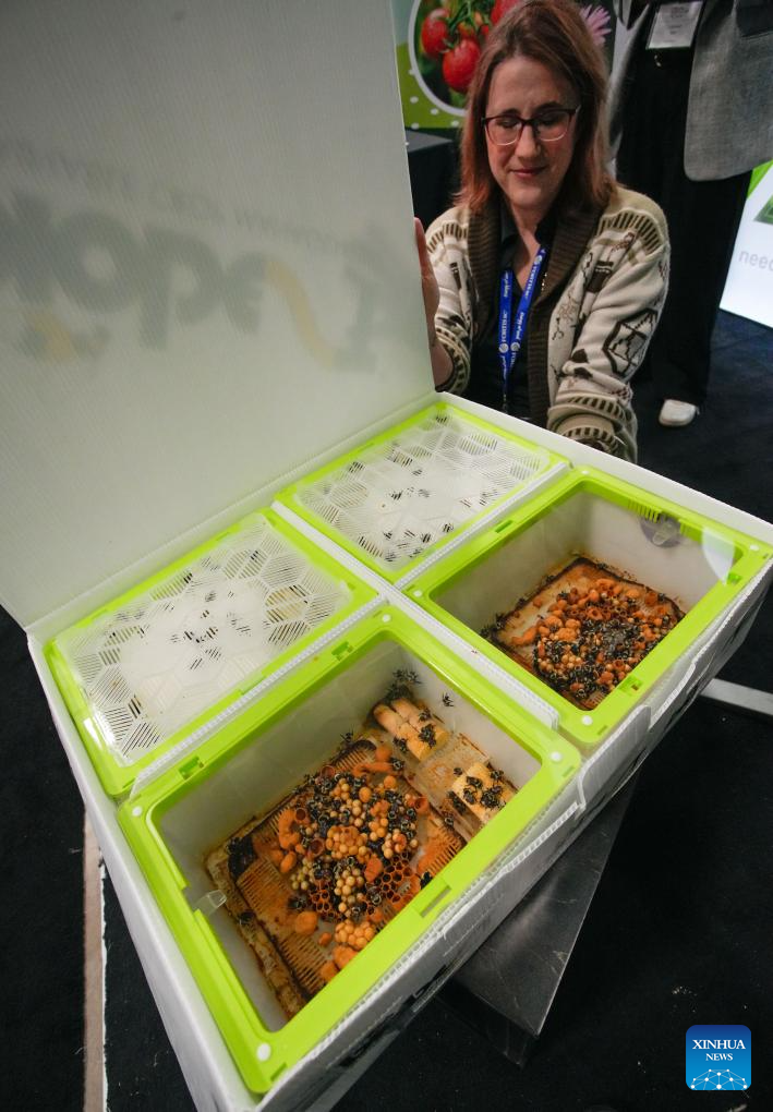 A woman shows a bee pollination box designed to enhance crop farming at the 2025 Pacific Agriculture Show in Abbotsford, British Columbia, Canada, on Jan. 23, 2025. Showcasing the latest and most innovative equipment and technology for the agriculture industry, the three-day show kicked off here on Thursday. (Photo by Liang Sen/Xinhua)
