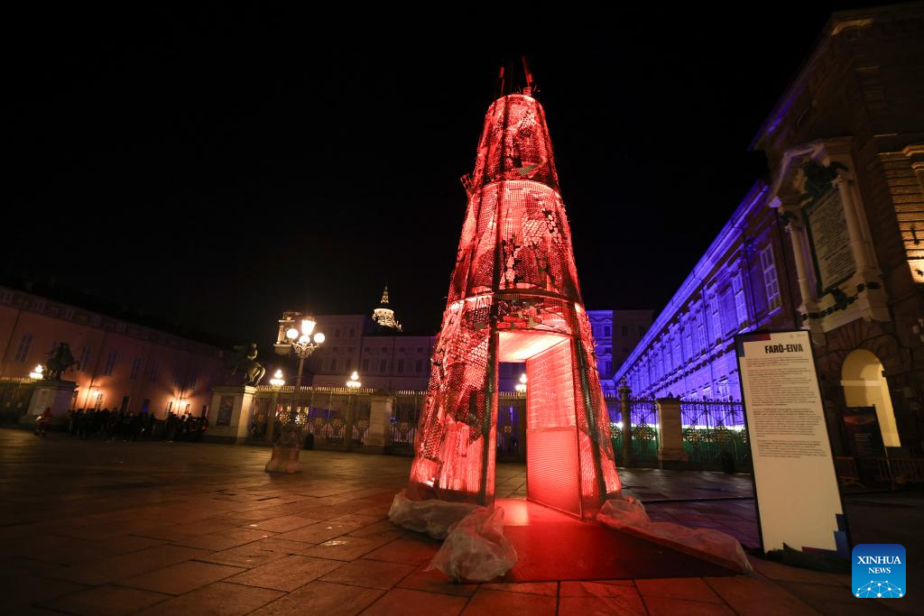 The cauldron is seen in front of Royal Palace of Turin during the closing ceremony of the 2025 FISU Winter World University Games in Turin, Italy, Jan. 23, 2025. (Xinhua/Li Jing)