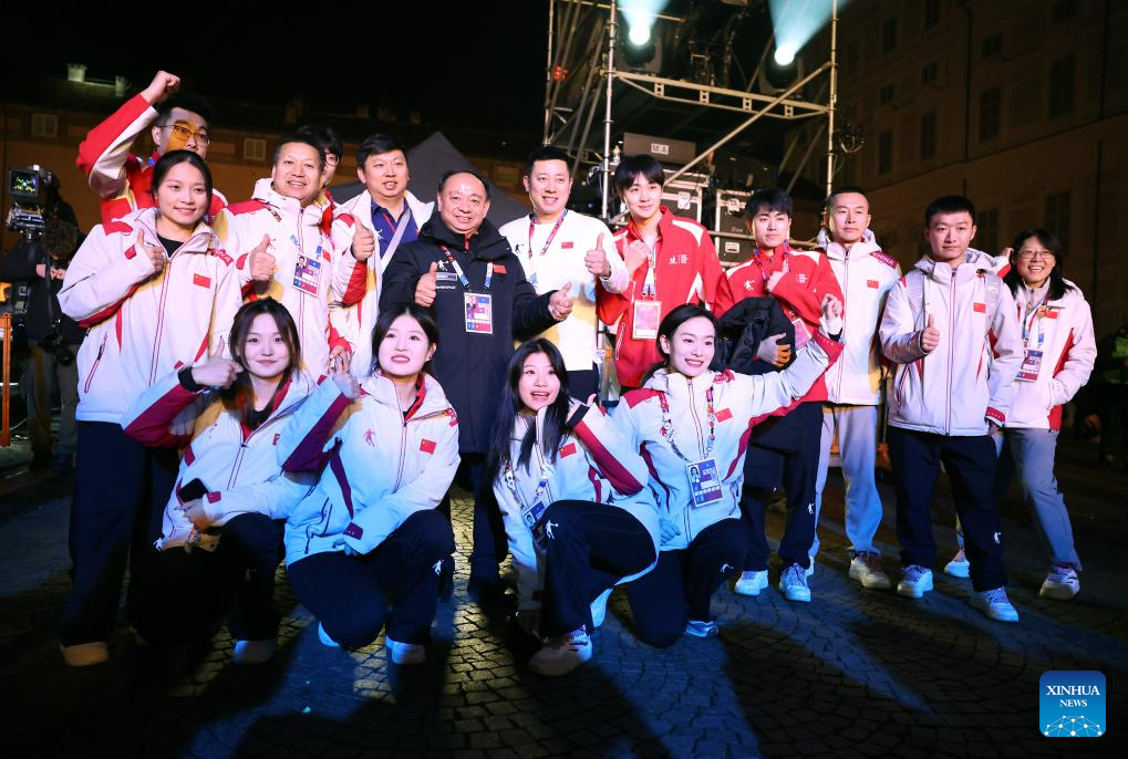 Members of the Chinese delegation pose for photos during the closing ceremony of the 2025 FISU Winter World University Games in Turin, Italy, Jan. 23, 2025. (Xinhua/Li Jing)
