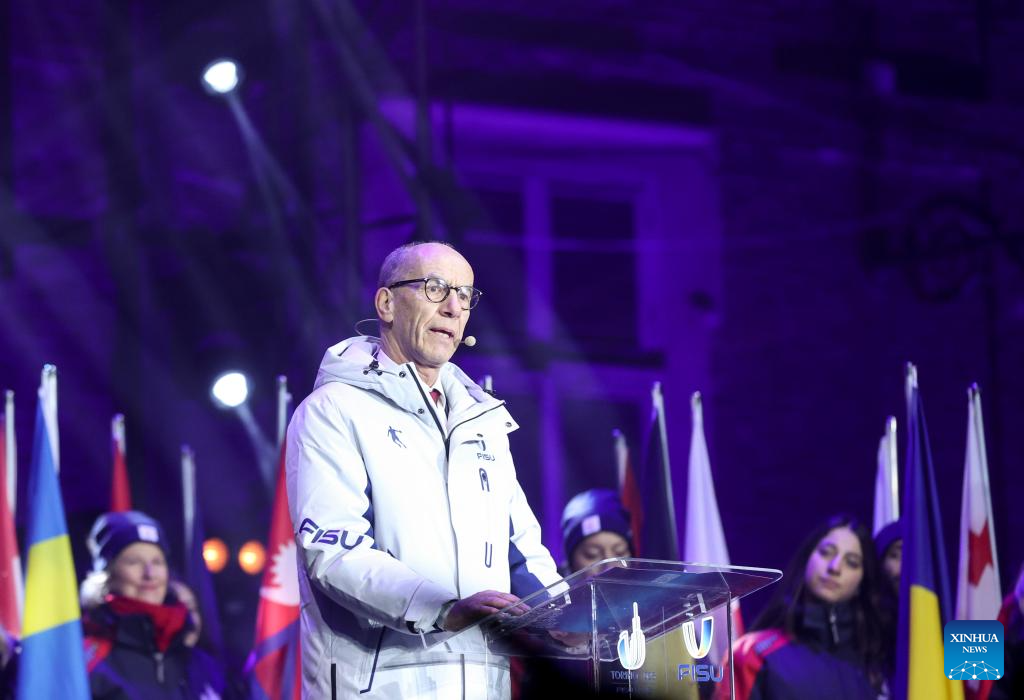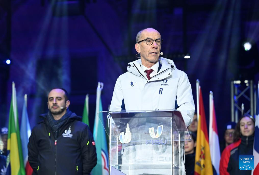 Leonz Eder, President of FISU, delivers a speech during the closing ceremony of the 2025 FISU Winter World University Games in Turin, Italy, Jan. 23, 2025. (Xinhua/Li Jing)