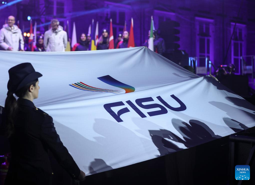 People watch the lowering of the FISU flag during the closing ceremony of the 2025 FISU Winter World University Games in Turin, Italy, Jan. 23, 2025. (Xinhua/Li Jing)