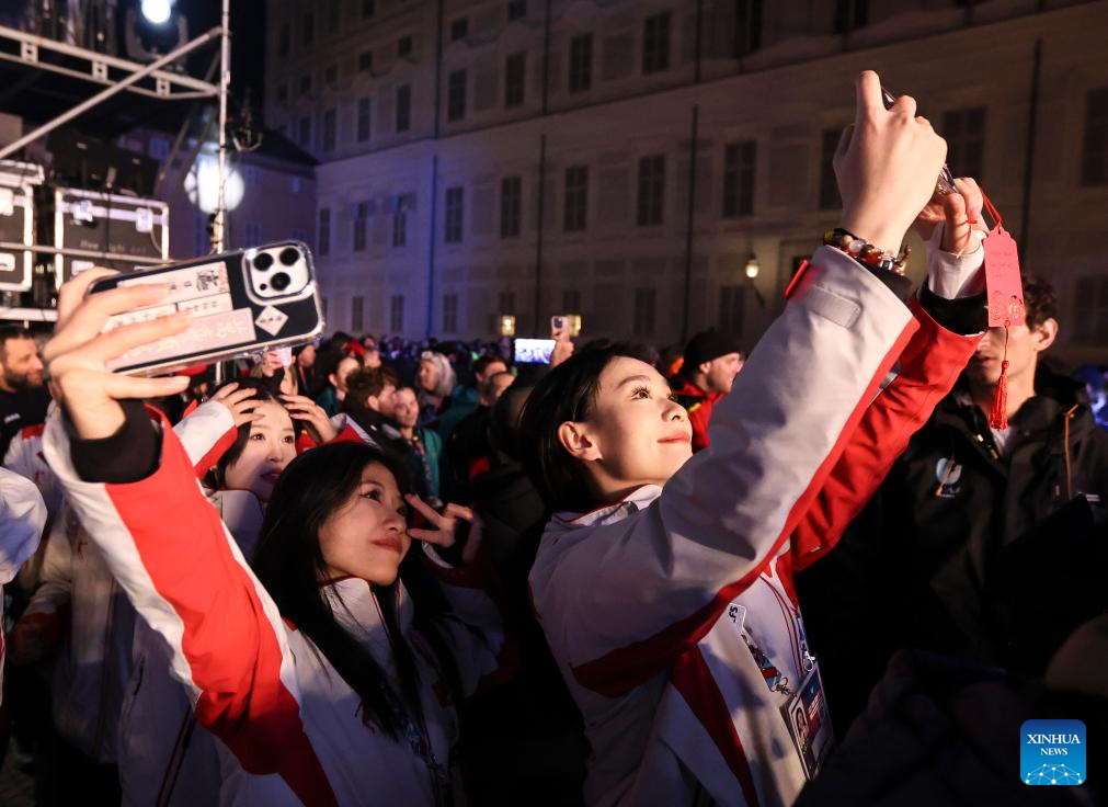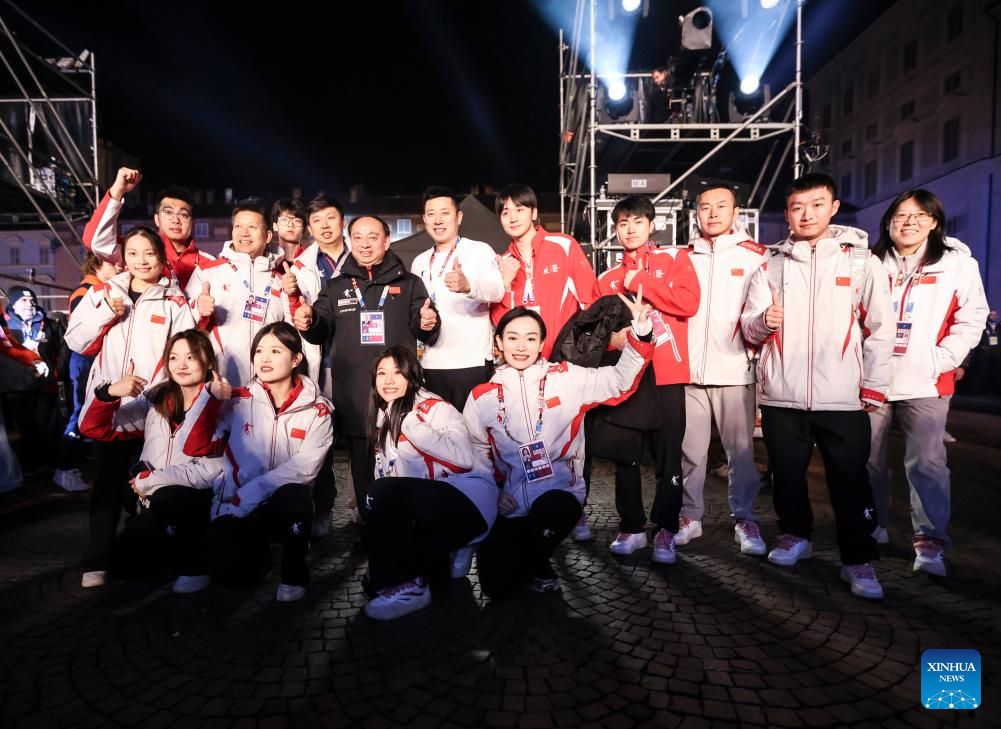 Members of the Chinese delegation pose for photos during the closing ceremony of the 2025 FISU Winter World University Games in Turin, Italy, Jan. 23, 2025. (Xinhua/Zhang Chen)