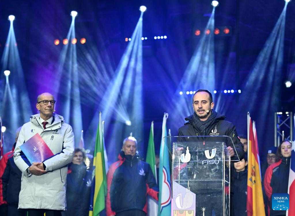 Alessandro Ciro Sciretti (R), president of the Turin 2025 organizing committee, delivers a speech during the closing ceremony of the 2025 FISU Winter World University Games in Turin, Italy, Jan. 23, 2025. (Xinhua/He Canling)