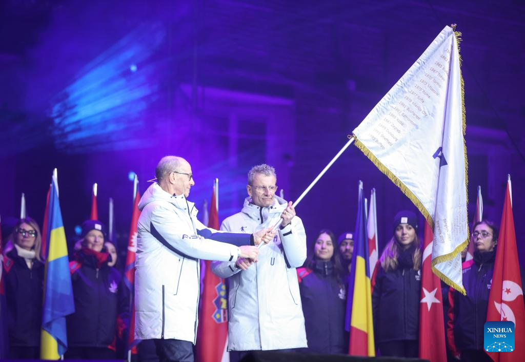 Leonz Eder (L), President of FISU, hands over the FISU flag to Matthias Remund, Secretary General and CEO of FISU during the closing ceremony of the 2025 FISU Winter World University Games in Turin, Italy, Jan. 23, 2025. (Xinhua/Li Jing)