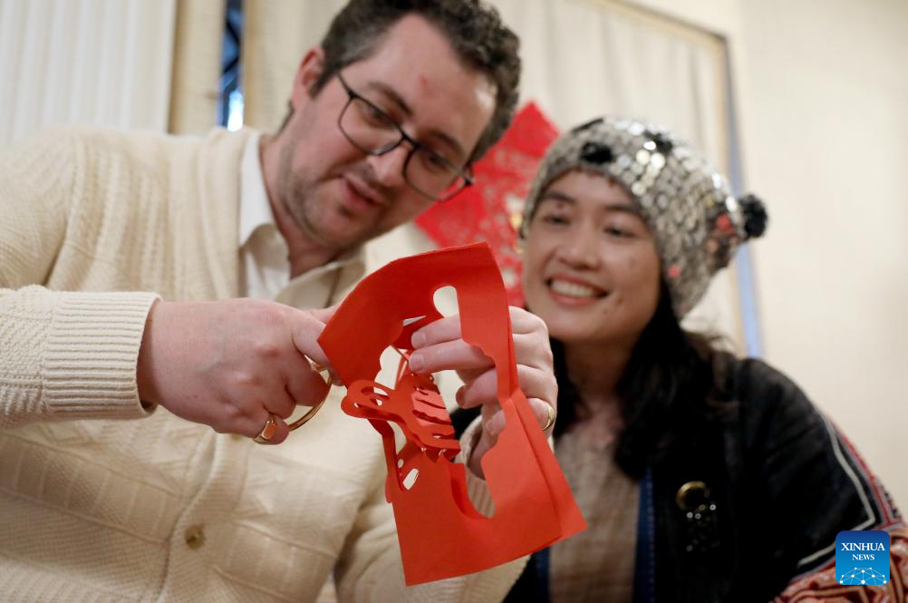 A man learns paper cutting during the "Intangible Cultural Heritage Yaji" event in London, Britain, Jan. 23, 2025. (Xinhua/Li Ying)