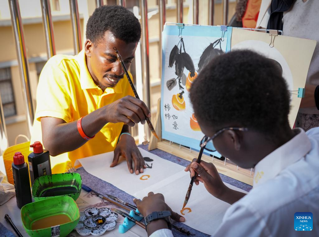 People try traditional Chinese painting during an event to celebrate the upcoming Chinese New Year, or the Spring Festival, in Nairobi, Kenya on Jan. 24, 2025. (Xinhua/Li Yahui)