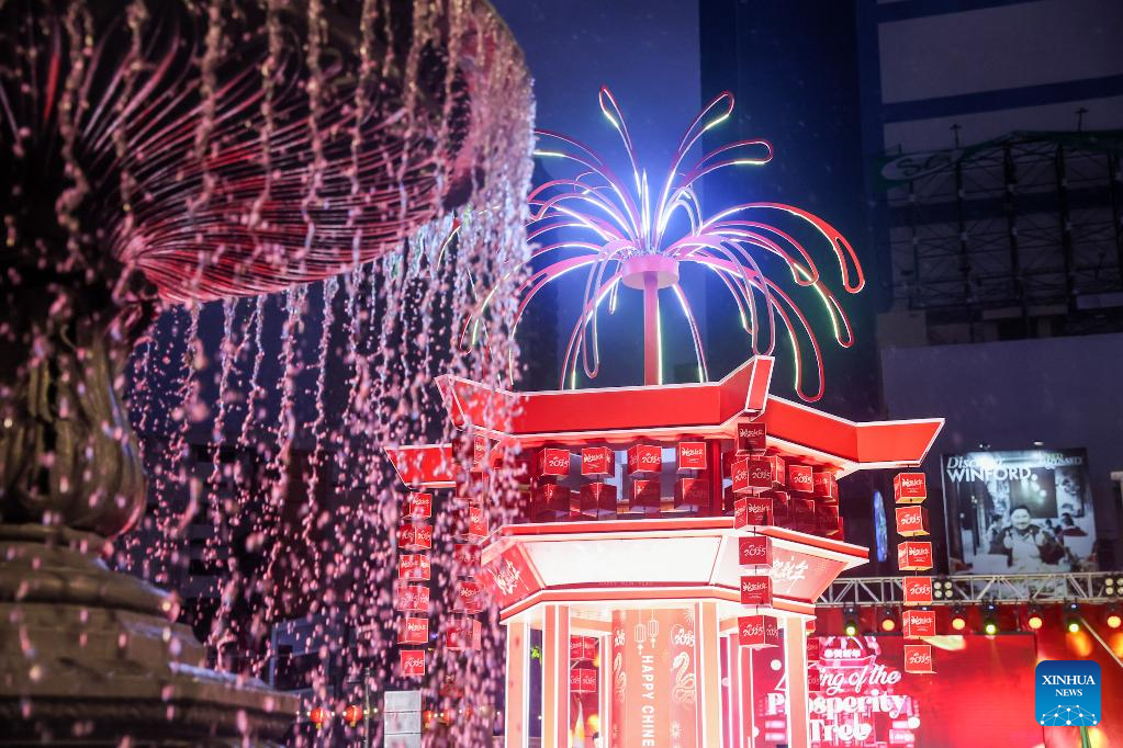 The prosperity tree is pictured during its lighting ceremony to celebrate the upcoming Chinese Lunar New Year in Manila, the Philippines, Jan. 24, 2025. (Photo by Rouelle Umali/Xinhua)