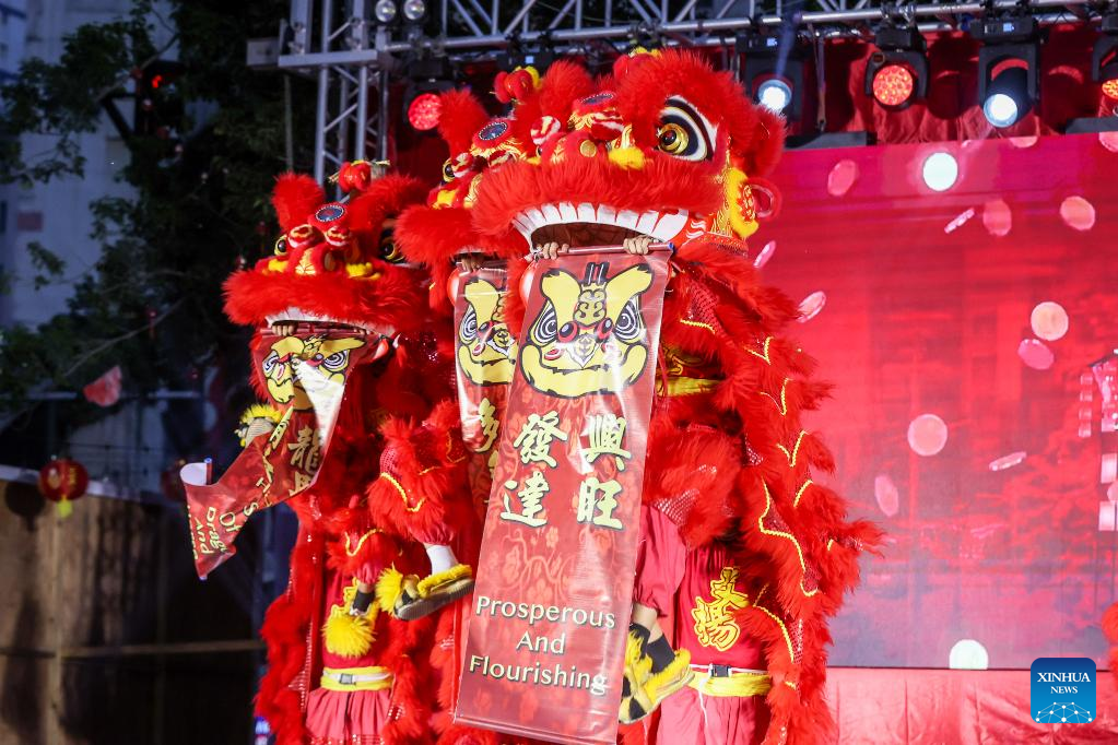 Lion dancers perform during the ceremonial lighting of the prosperity tree to celebrate the upcoming Chinese Lunar New Year in Manila, the Philippines, on Jan. 24, 2025. (Photo by Rouelle Umali/Xinhua)