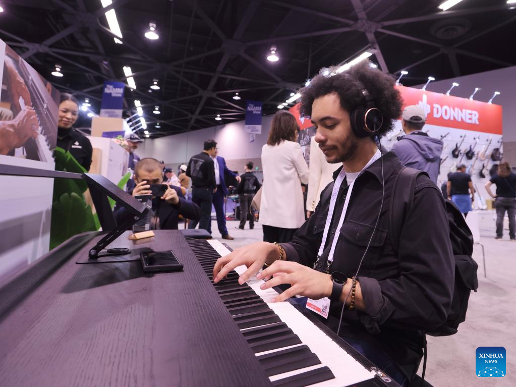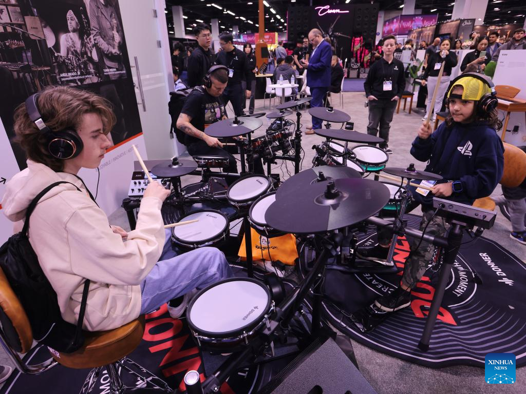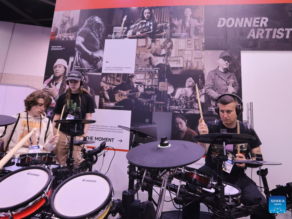 People play musical instruments in the exhibition area of Donner, a musical company based in south China's Guangdong Province, during the 2025 National Association of Music Merchants (NAMM) Show at the Anaheim Convention Center in Orange County, California, the United States, on Jan. 23, 2025. (Photo by Qiu Chen/Xinhua)