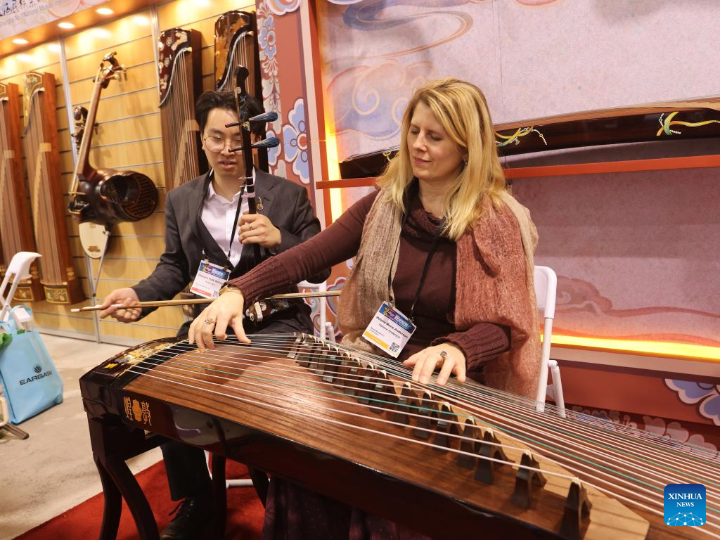 A visitor plays a musical instrument at the booth of Shanghai No. 1 National Musical Instruments Factory during the 2025 National Association of Music Merchants (NAMM) Show at the Anaheim Convention Center in Orange County, California, the United States, on Jan. 23, 2025. (Photo by Qiu Chen/Xinhua)
