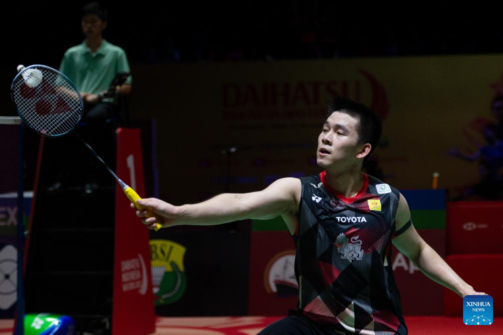 Kunlavut Vitidsarn hits a return during the men's singles final between Jonatan Christie of Indonesia and Kunlavut Vitidsarn of Thailand at 2025 Indonesia Masters badminton tournament in Jakarta, Indonesia, Jan. 26, 2025. (Xinhua/Veri Sanovri)
