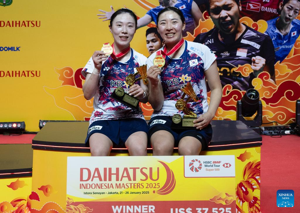 Winners Kim Hye Jeong (L)/Kong Hee Yong pose for photos during the awarding ceremony after the women's doubles final between Kim Hye Jeong/Kong Hee Yong of South Korea and Pearly Tan/Muralitharan Thinaah of Malaysia at 2025 Indonesia Masters badminton tournament in Jakarta, Indonesia, Jan. 26, 2025. (Xinhua/Veri Sanovri)