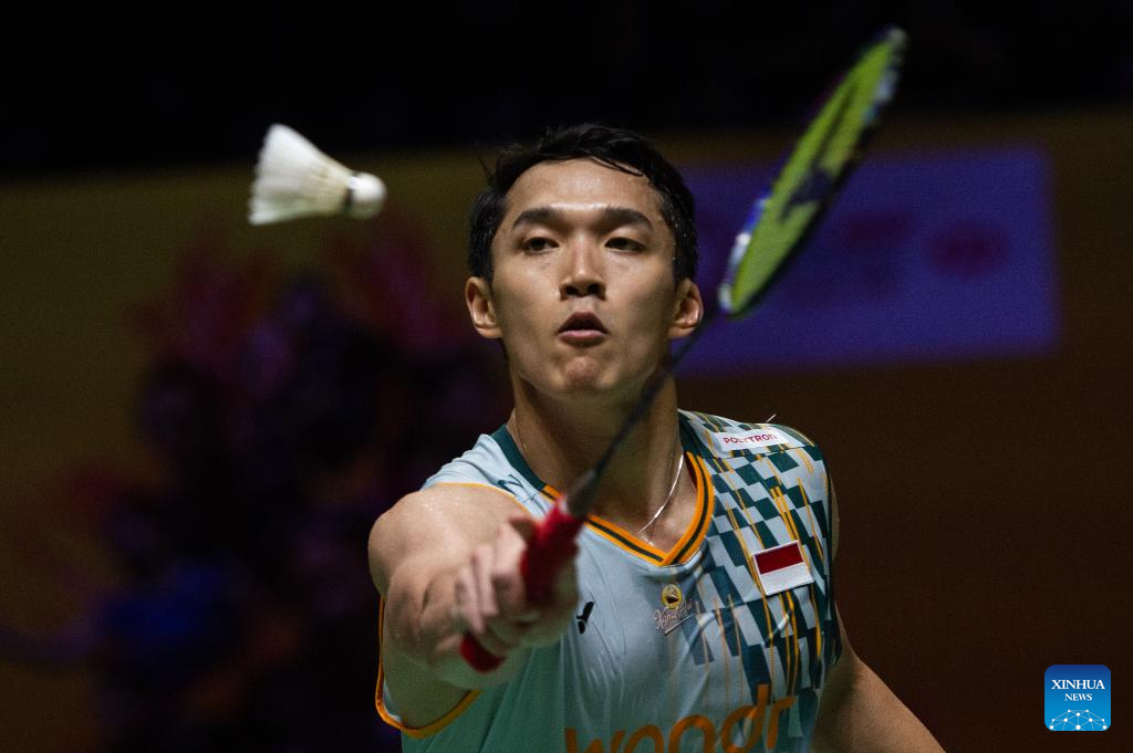 Jonatan Christie hits a return during the men's singles final between Jonatan Christie of Indonesia and Kunlavut Vitidsarn of Thailand at 2025 Indonesia Masters badminton tournament in Jakarta, Indonesia, Jan. 26, 2025. (Xinhua/Veri Sanovri)