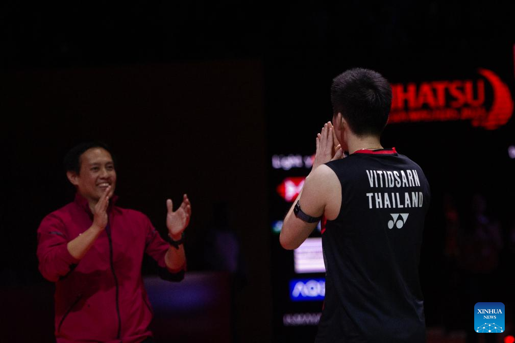 Kunlavut Vitidsarn (R) greets his coach after winning the men's singles final between Jonatan Christie of Indonesia and Kunlavut Vitidsarn of Thailand at 2025 Indonesia Masters badminton tournament in Jakarta, Indonesia, Jan. 26, 2025. (Xinhua/Veri Sanovri)