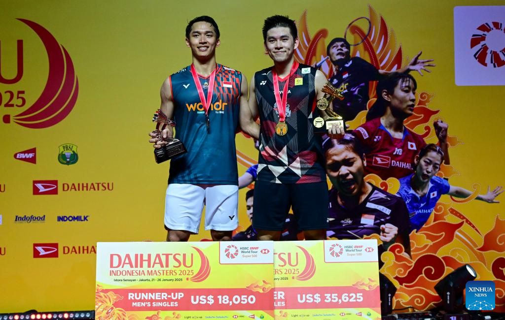 Winner Kunlavut Vitidsarn (R) of Thailand and runner-up Jonatan Christie of Indonesia pose for photos at the awarding ceremony after their men's singles final at 2025 Indonesia Masters badminton tournament in Jakarta, Indonesia, Jan. 26, 2025. (Xinhua/Zulkarnain)