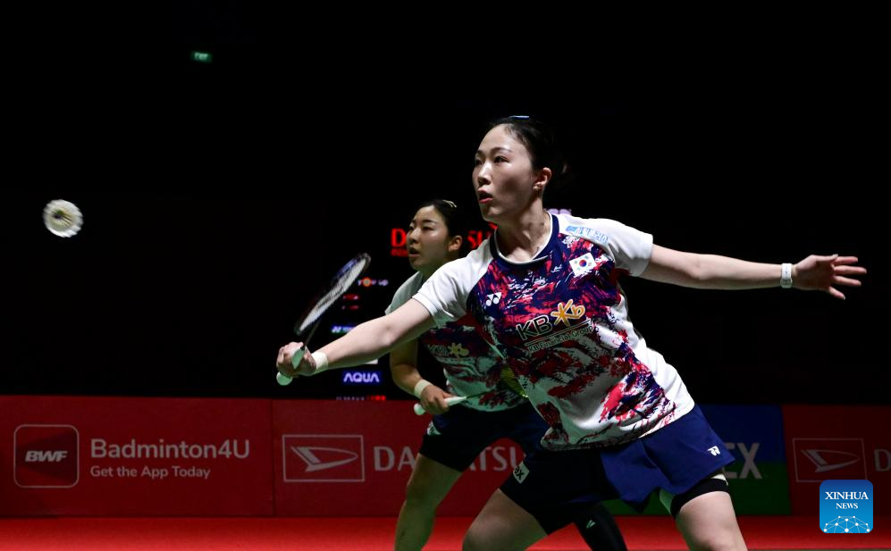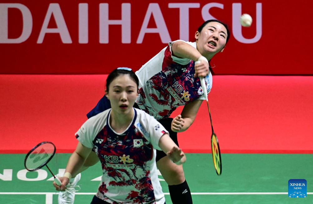 Kim Hye Jeong (front)/Kong Hee Yong compete during the women's doubles final between Kim Hye Jeong/Kong Hee Yong of South Korea and Pearly Tan/Muralitharan Thinaah of Malaysia at 2025 Indonesia Masters badminton tournament in Jakarta, Indonesia, Jan. 26, 2025. (Xinhua/Zulkarnain)