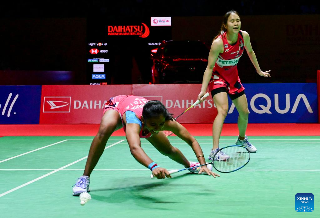 Pearly Tan (R)/Muralitharan Thinaah compete during the women's doubles final between Kim Hye Jeong/Kong Hee Yong of South Korea and Pearly Tan/Muralitharan Thinaah of Malaysia at 2025 Indonesia Masters badminton tournament in Jakarta, Indonesia, Jan. 26, 2025. (Xinhua/Zulkarnain)