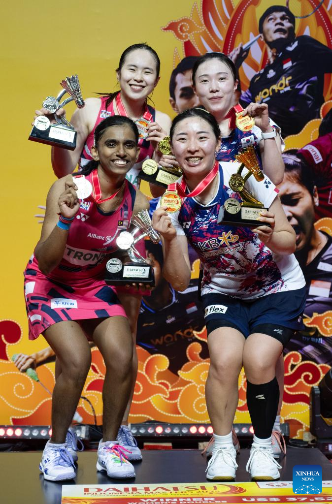 Winner Ratchanok Intanon (R) and runner-up Sim Yu Jin pose for photos during the awarding ceremony after the women's singles final match between Ratchanok Intanon of Thailand and Sim Yu Jin of South Korea at 2025 Indonesia Masters badminton tournament in Jakarta, Indonesia, Jan. 26, 2025. (Xinhua/Zulkarnain)