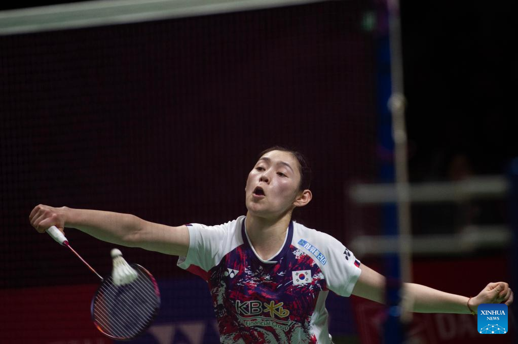 Sim Yu Jin hits a return during the women's singles final match between Ratchanok Intanon of Thailand and Sim Yu Jin of South Korea at 2025 Indonesia Masters badminton tournament in Jakarta, Indonesia, Jan. 26, 2025. (Xinhua/Veri Sanovri)
