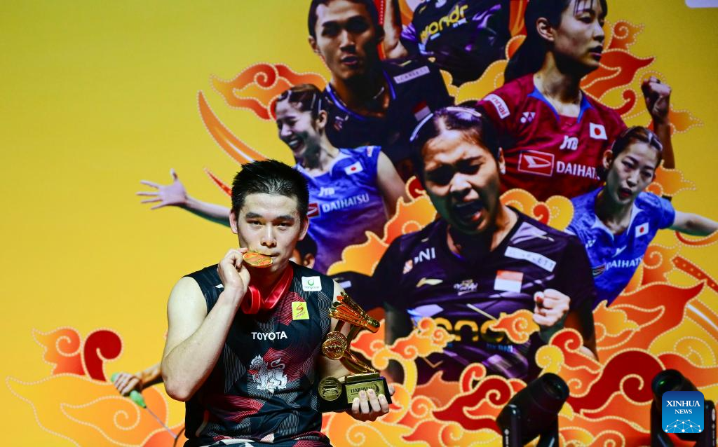 Winner Kunlavut Vitidsarn poses for photos at the awarding ceremony after the men's singles final between Jonatan Christie of Indonesia and Kunlavut Vitidsarn of Thailand at 2025 Indonesia Masters badminton tournament in Jakarta, Indonesia, Jan. 26, 2025. (Xinhua/Zulkarnain)