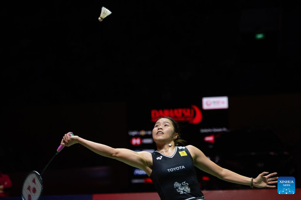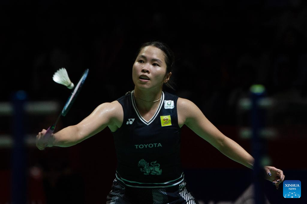 Ratchanok Intanon hits a return during the women's singles final match between Ratchanok Intanon of Thailand and Sim Yu Jin of South Korea at 2025 Indonesia Masters badminton tournament in Jakarta, Indonesia, Jan. 26, 2025. (Xinhua/Veri Sanovri)