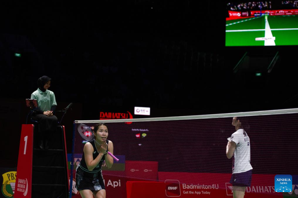 Ratchanok Intanon (L) and Sim Yu Jin wait for the result of challenge during the women's singles final match between Ratchanok Intanon of Thailand and Sim Yu Jin of South Korea at 2025 Indonesia Masters badminton tournament in Jakarta, Indonesia, Jan. 26, 2025. (Xinhua/Veri Sanovri)