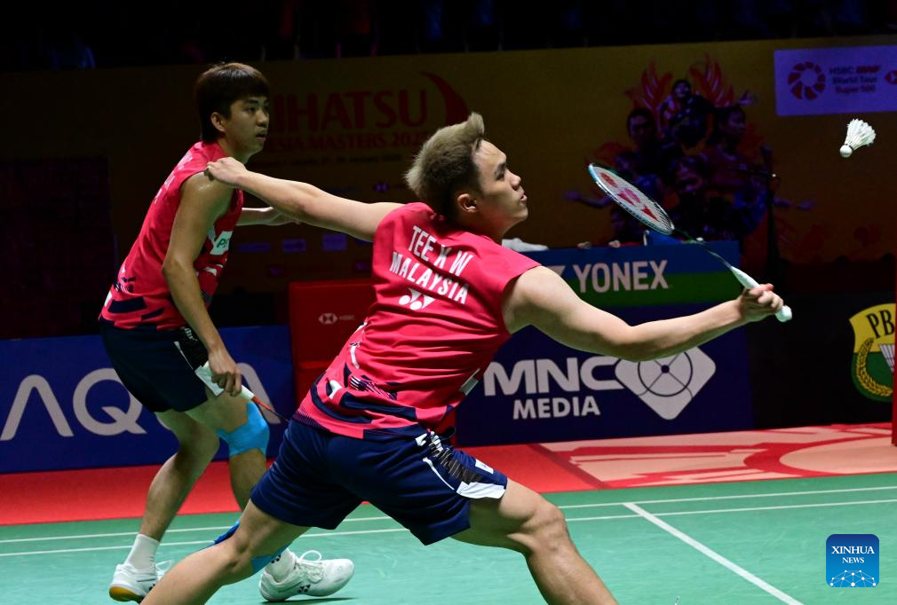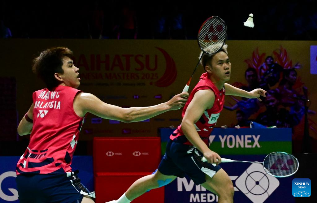 Man Wei Chong/Tee Kai Wun (R) compete during the men's doubles final match between Man Wei Chong/Tee Kai Wun of Malaysia and Fajar Alfian/Muhammad Rian Ardianto of Indonesia at 2025 Indonesia Masters badminton tournament in Jakarta, Indonesia, Jan. 26, 2025. (Xinhua/Zulkarnain)