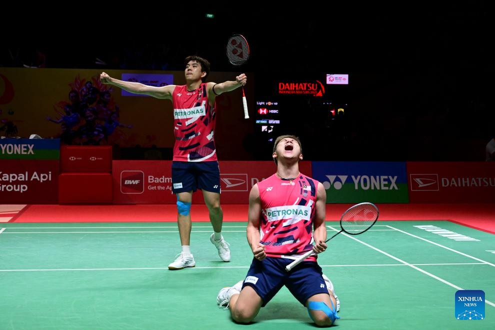 Man Wei Chong/Tee Kai Wun (R) celebrate after winning the men's doubles final match between Man Wei Chong/Tee Kai Wun of Malaysia and Fajar Alfian/Muhammad Rian Ardianto of Indonesia at 2025 Indonesia Masters badminton tournament in Jakarta, Indonesia, Jan. 26, 2025. (Xinhua/Zulkarnain)