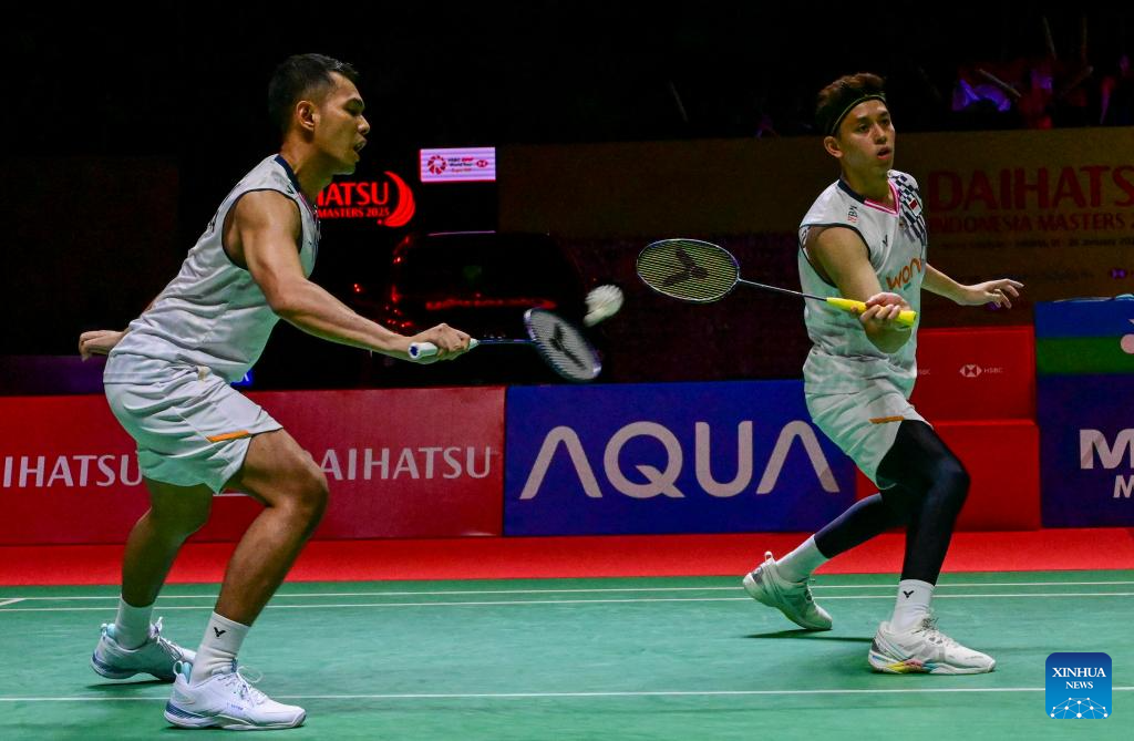 Fajar Alfian (L)/Muhammad Rian Ardianto compete during the men's doubles final match between Man Wei Chong/Tee Kai Wun of Malaysia and Fajar Alfian/Muhammad Rian Ardianto of Indonesia at 2025 Indonesia Masters badminton tournament in Jakarta, Indonesia, Jan. 26, 2025. (Xinhua/Zulkarnain)