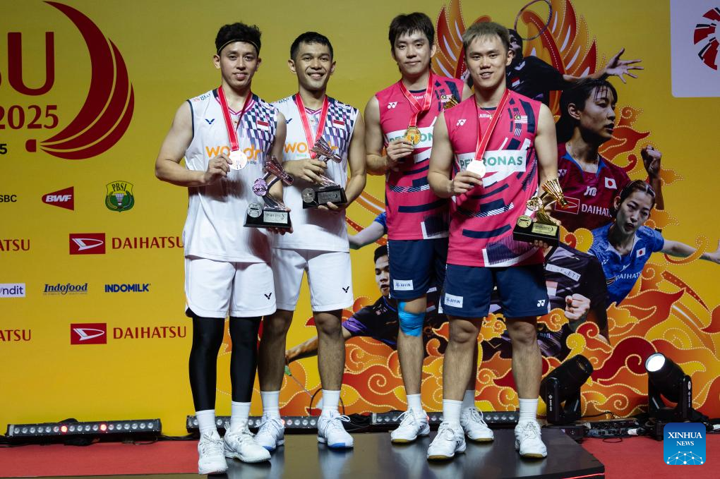 Winners Man Wei Chong (2nd R)/Tee Kai Wun (1st R) and runners-up Fajar Alfian (2nd L)/Muhammad Rian Ardianto pose for photos during the awarding ceremony after the men's doubles final match between Man Wei Chong/Tee Kai Wun of Malaysia and Fajar Alfian/Muhammad Rian Ardianto of Indonesia at 2025 Indonesia Masters badminton tournament in Jakarta, Indonesia, Jan. 26, 2025. (Xinhua/Veri Sanovri)