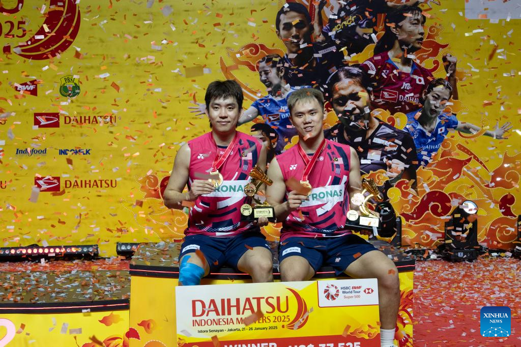 Winners Man Wei Chong (L)/Tee Kai Wun pose for photos during the awarding ceremony after the men's doubles final match between Man Wei Chong/Tee Kai Wun of Malaysia and Fajar Alfian/Muhammad Rian Ardianto of Indonesia at 2025 Indonesia Masters badminton tournament in Jakarta, Indonesia, Jan. 26, 2025. (Xinhua/Veri Sanovri)