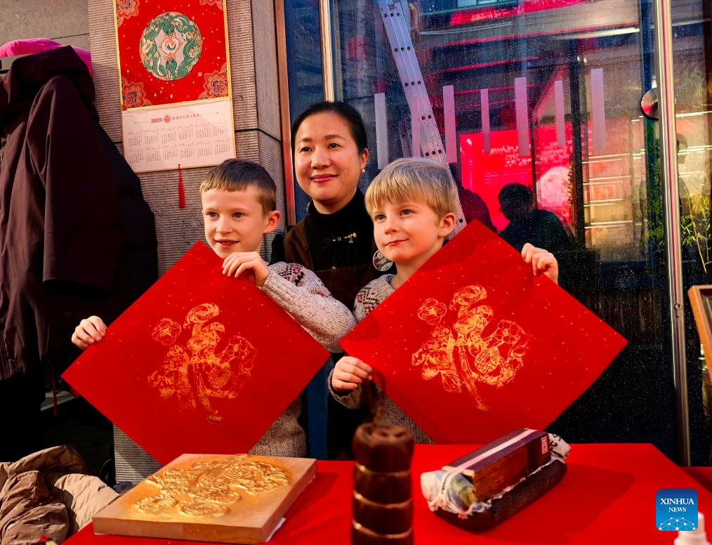 Children pose for photos with woodblock paintings of Chinese character "Fu" which means "good fortune" during a cultural tourism promotion event ahead of the Spring Festival, or the Chinese New Year, at the China Cultural Center in Brussels, Belgium, on Jan. 24, 2025. Various activities marking the upcoming Chinese New Year are being held in many countries around the world as the festival approaches. (Xinhua/Pan Geping)