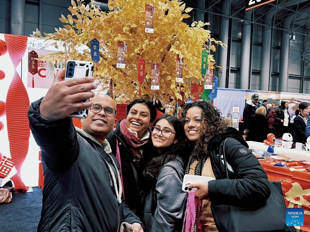 Visitors pose for a selfie under a "wishing tree" at the New York Travel & Adventure Show in New York City, the United States, on Jan. 25, 2025. A selection of Chinese museums showcased their cultural heritage at the New York Travel & Adventure Show on Saturday, aiming to attract international visitors to China. The two-day event attracted over 550 travel providers from around the world. The China booth, organized by the China National Tourist Office in New York and New York City's Memor Museum, featured interactive experiences such as virtual reality views of artifacts from the ancient archaeological site of Sanxingdui in China's Sichuan Province.(Photo by Qin Mingwei/Xinhua)