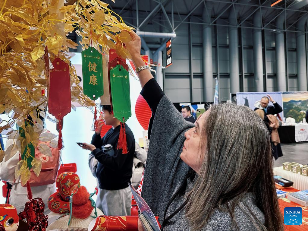 A visitor hangs her wishing card onto a "wishing tree" at the New York Travel & Adventure Show in New York City, the United States, on Jan. 25, 2025. A selection of Chinese museums showcased their cultural heritage at the New York Travel & Adventure Show on Saturday, aiming to attract international visitors to China.