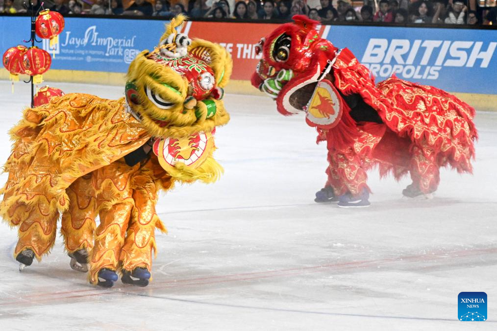 Lion dancers perform on ice to celebrate the upcoming Chinese Lunar New Year, or the Spring Festival, at Bintaro Exchange Mall in South Tangerang, Banten Province, Indonesia, Jan. 25, 2025. (Xinhua/Agung Kuncahya B.)