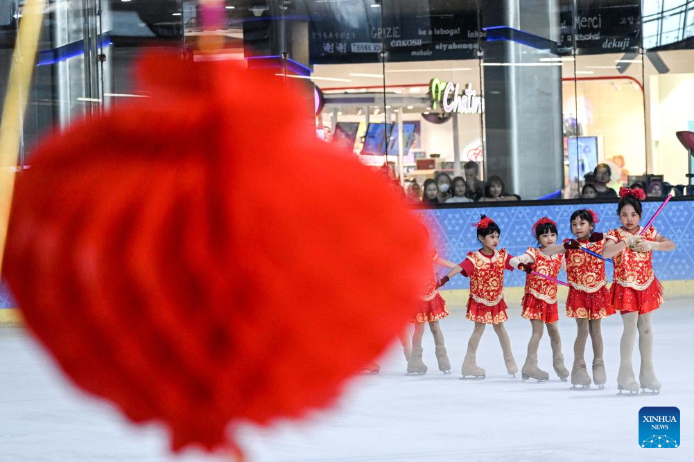 Children take part in a performance on ice to celebrate the upcoming Chinese Lunar New Year, or the Spring Festival, at Bintaro Exchange Mall in South Tangerang, Banten Province, Indonesia, Jan. 25, 2025. (Xinhua/Agung Kuncahya B.)
