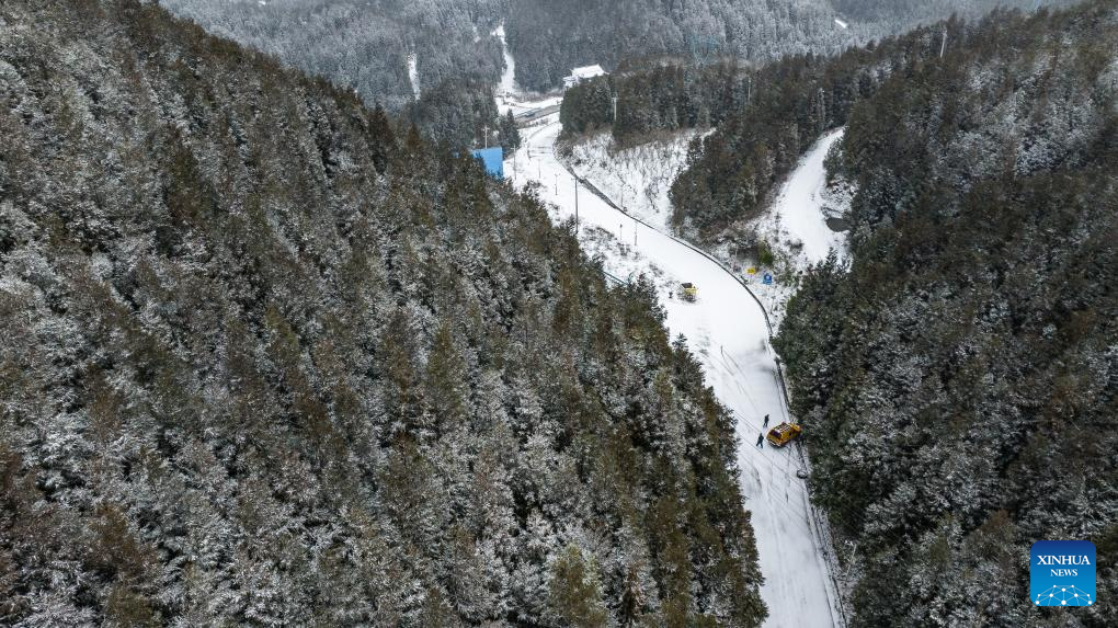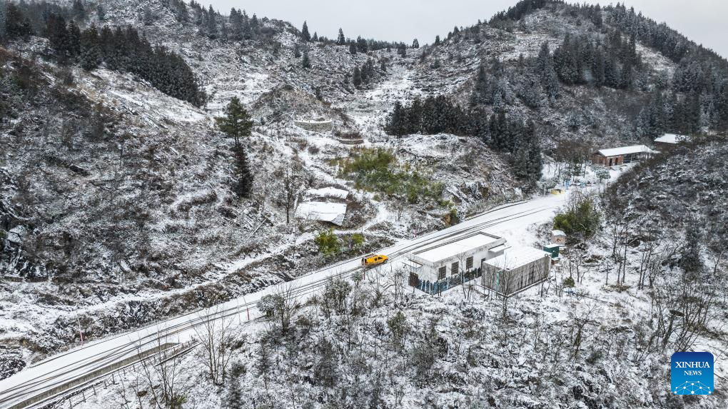 An aerial drone photo taken on Jan. 26, 2025 shows staff members of local power supply bureau on their way to a check point in Liupanshui City, southwest China's Guizhou Province. In case of power disruption due to continuous snowfall, local power supply bureau carried out an urgent inspection and maintenance work to ensure the safe and stable operation of local power grid. (Xinhua/Tao Liang)