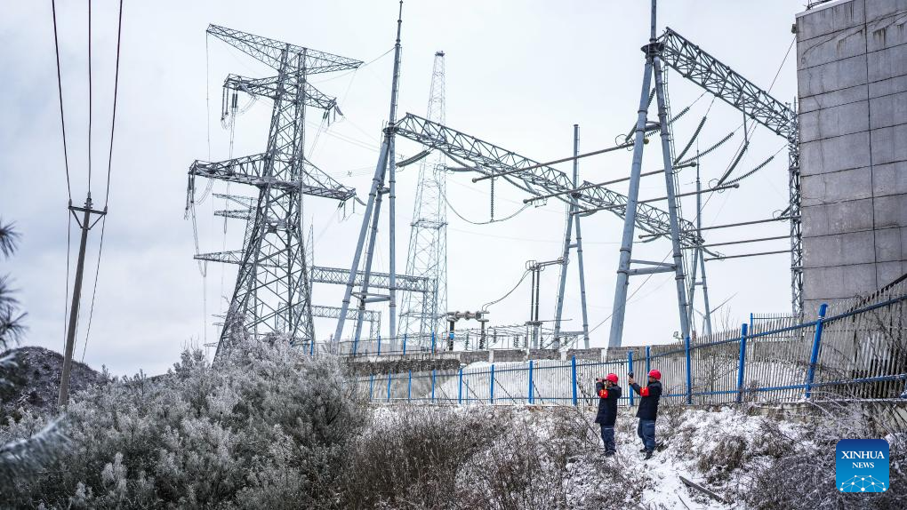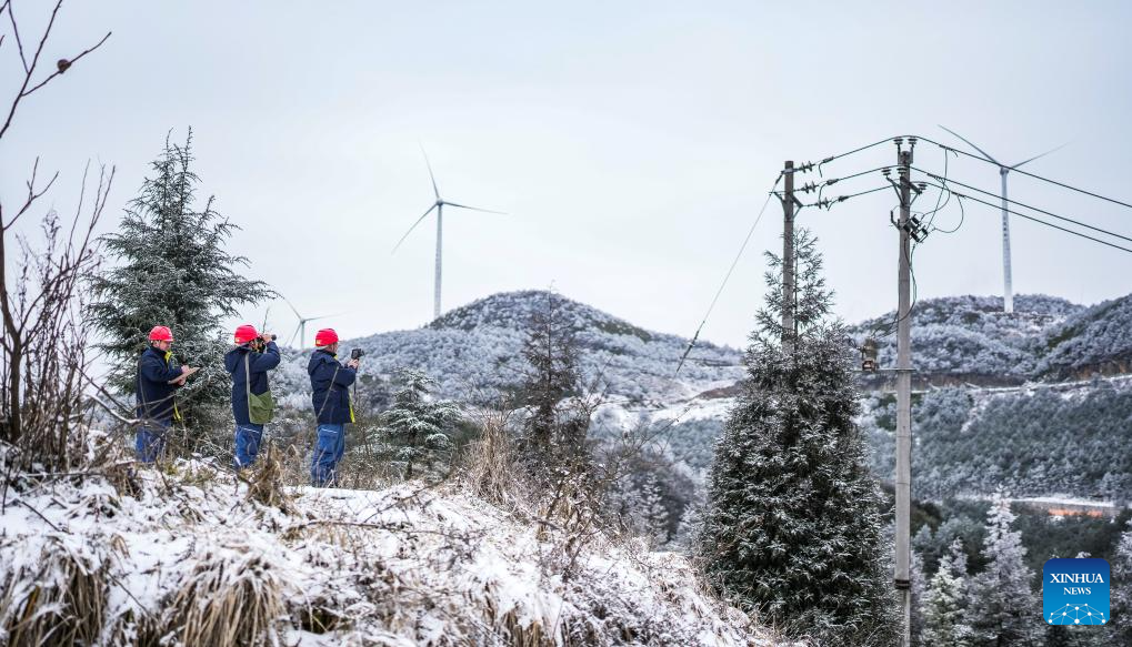 Staff members of local power supply bureau check power lines in Liupanshui City, southwest China's Guizhou Province, Jan. 26, 2025. In case of power disruption due to continuous snowfall, local power supply bureau carried out an urgent inspection and maintenance work to ensure the safe and stable operation of local power grid. (Xinhua/Tao Liang)