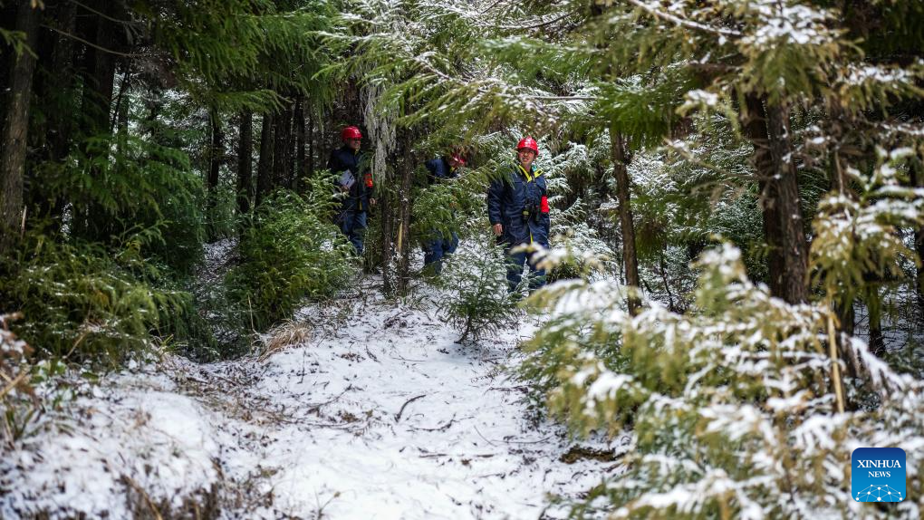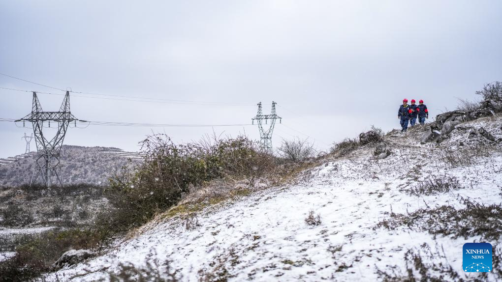 Staff members of local power supply bureau patrol in Liupanshui City, southwest China's Guizhou Province, Jan. 26, 2025. In case of power disruption due to continuous snowfall, local power supply bureau carried out an urgent inspection and maintenance work to ensure the safe and stable operation of local power grid. (Xinhua/Tao Liang)