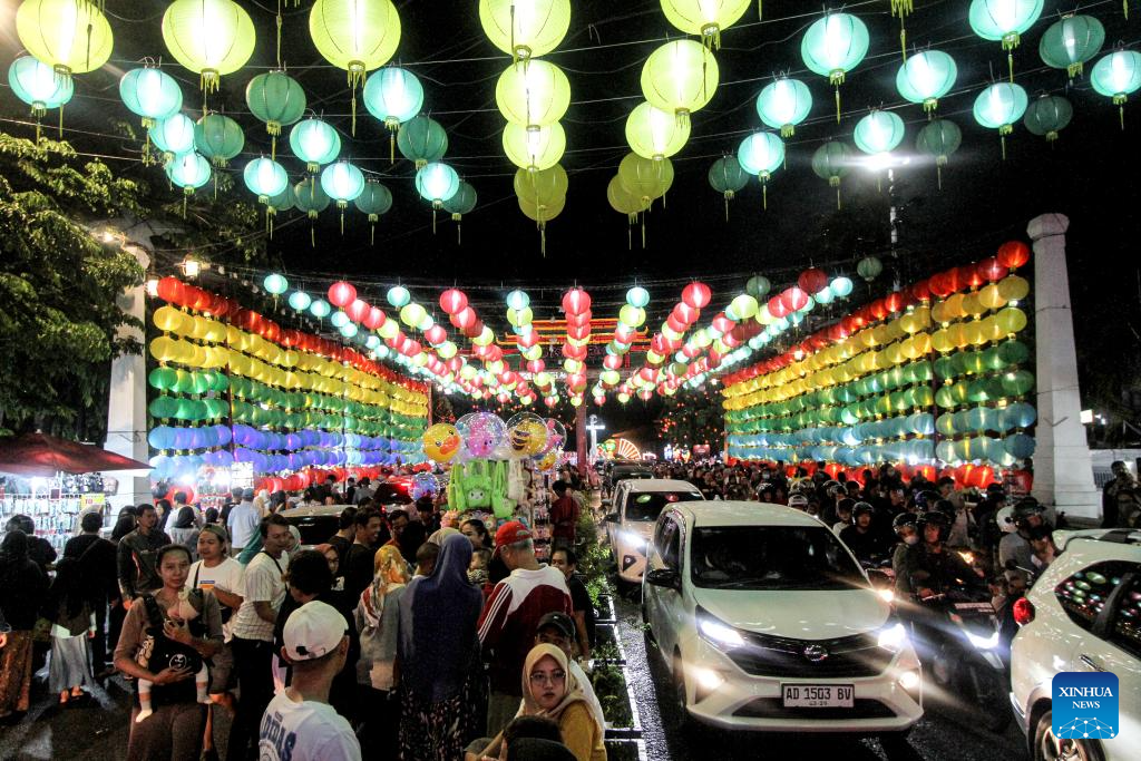 This photo taken on Jan. 27, 2025 shows people passing by lantern decorations installed for the Chinese New Year in Surakarta, Central Java, Indonesia. (Photo by Bram Selo/Xinhua)
